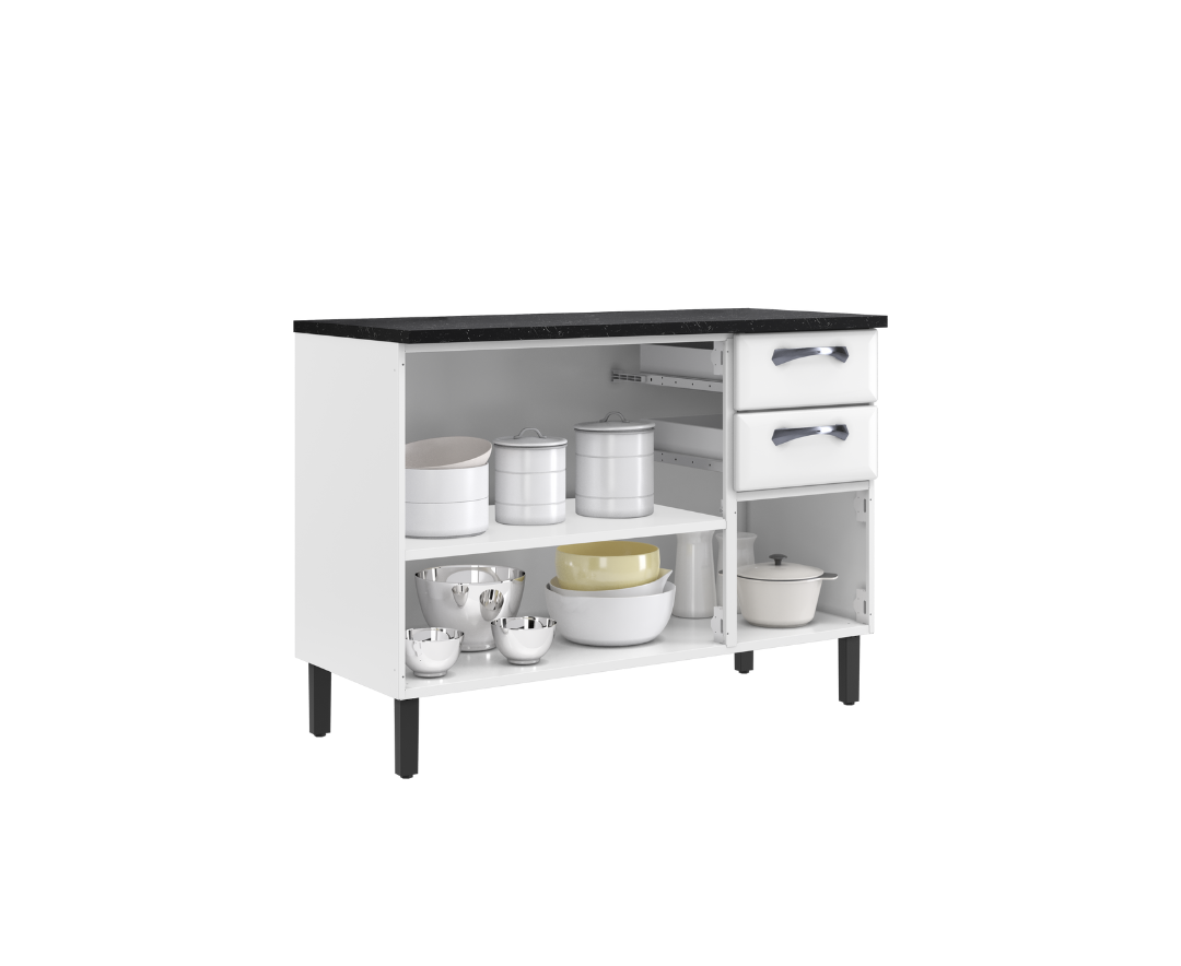Seu amplo espaço interno, com 3 portas e 2 gavetas, é ideal para organizar utensílios, mantimentos e acessórios de cozinha com praticidade e eficiência. Além disso, é um móvel fácil de limpar, facilitando a rotina do dia a dia.