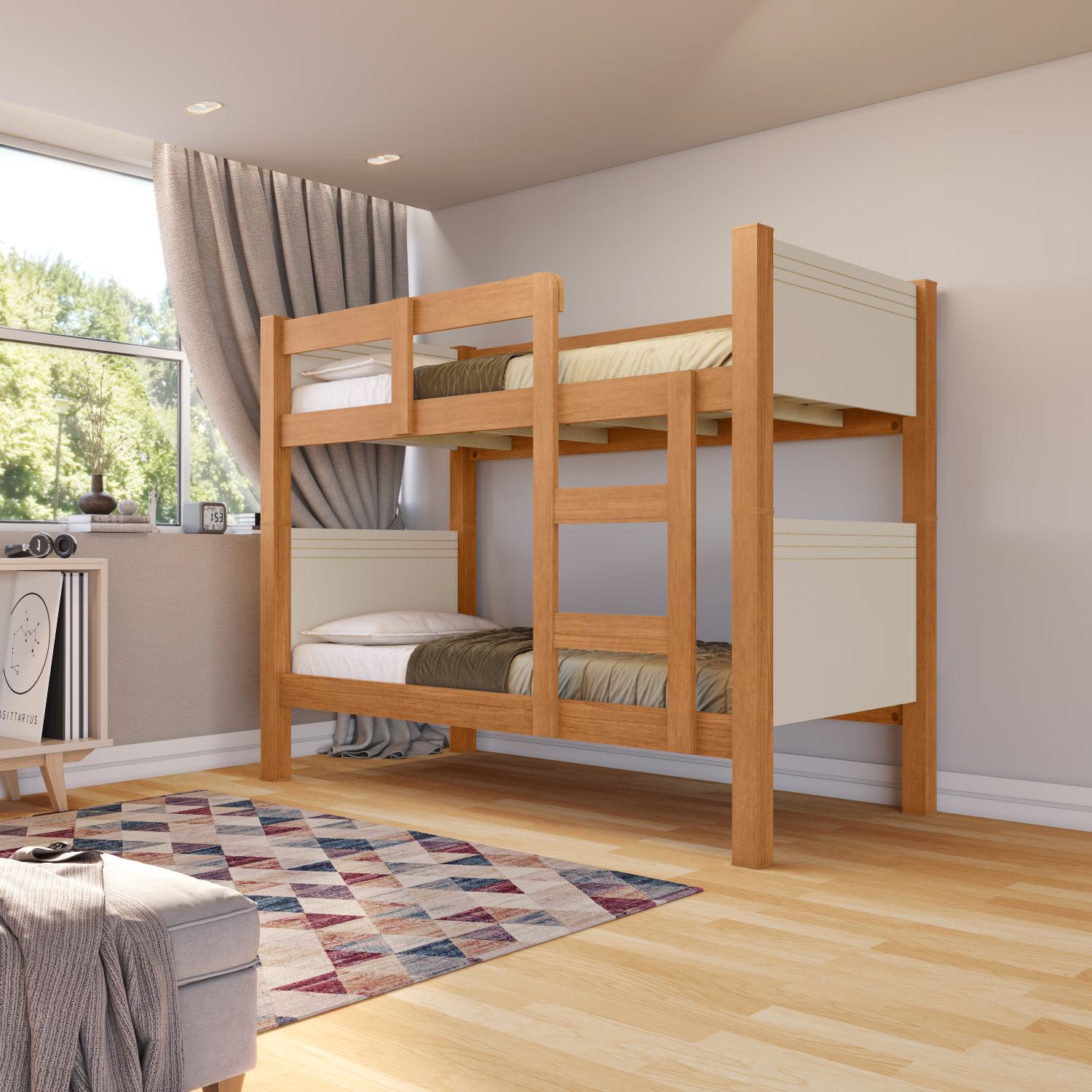 A Beliche 603002 é perfeita para fornecer conforto e qualidade na hora do descanso. Possui um design robusto, belo e inovador. Um móvel que ocupa pouco espaço e é ideal para quartos pequenos. Composta por duas camas, uma em cima da outra, e pode ser usadas por crianças, adolescentes ou adultos. Produzido em chapas de MDF e MDP (fibras de média densidade), com barras laterais de 25mm de espessura. Além disso, é fabricado com estrutura super reforçada, contando com pés da cabeceira peseira maciços com dimensões de 75x75mm. A Beliche conta ainda, com a possibilidade de poder ser montado como duas camas de solteiro separadas, conforme necessidade e escolha do cliente. Seu Estrado é confeccionado com travessas de eucalipto e ripas de MDF. A pintura em tinta ultravioleta de alta resistência e durabilidade com acabamento em verniz brilhante na cores cinamomo e off white, recobrem e protegem todo o produto. Proporcione mais beleza, conforto e tranquilidade para suas noites de sono.