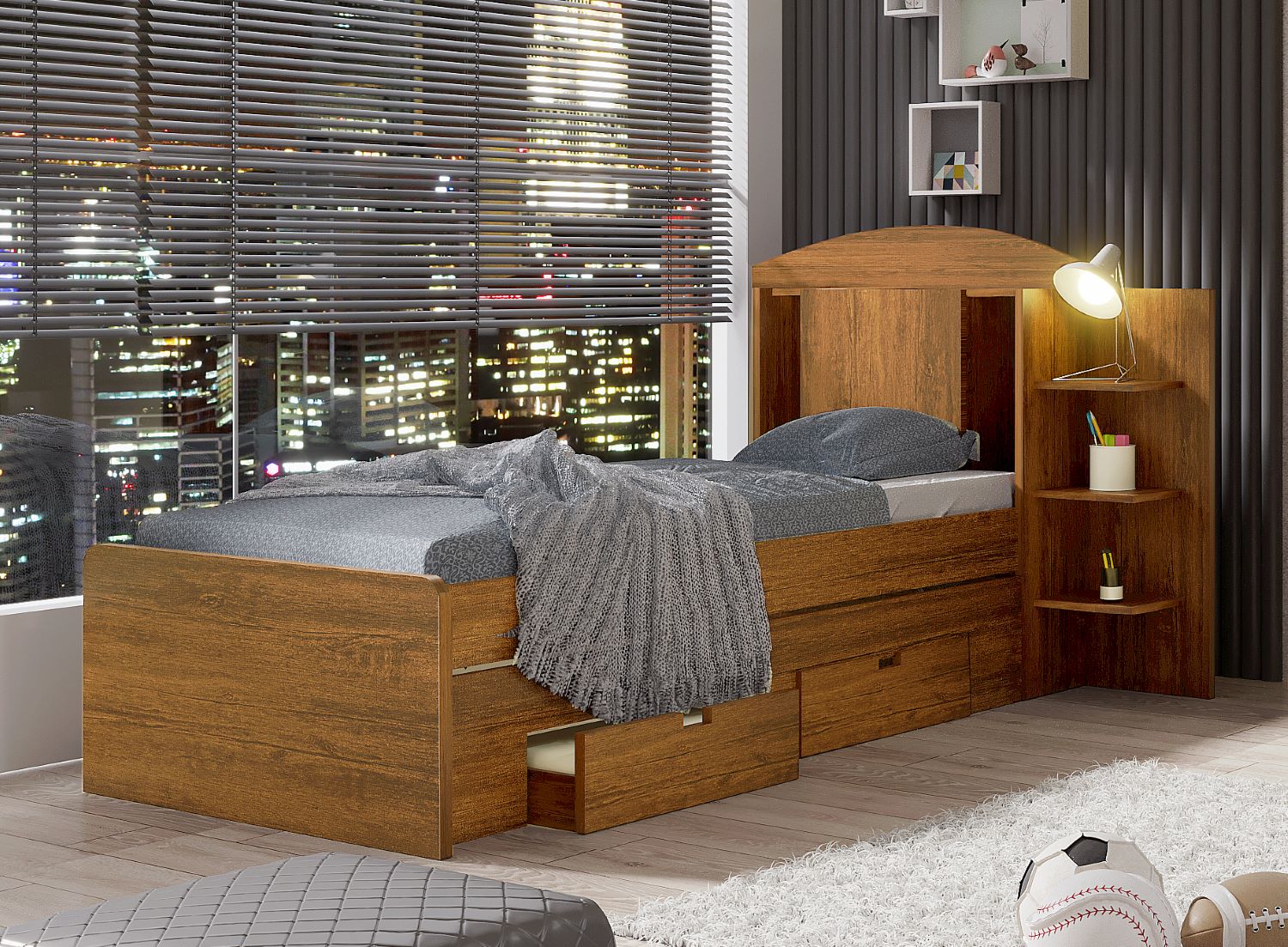 A Cama Solteiro 859326 é 100% MDF, pés maciço e possui um design moderno e elegante. Acompanha um baú na cabeceira da cama que trará maior praticidade e conforto para você poder guardar travesseiros e cobertores.