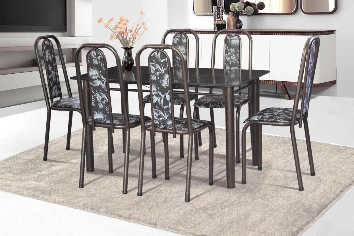 Conjunto Mesa 840048 Ardósia com 06 cadeiras Ouro Velho/Floral Preto