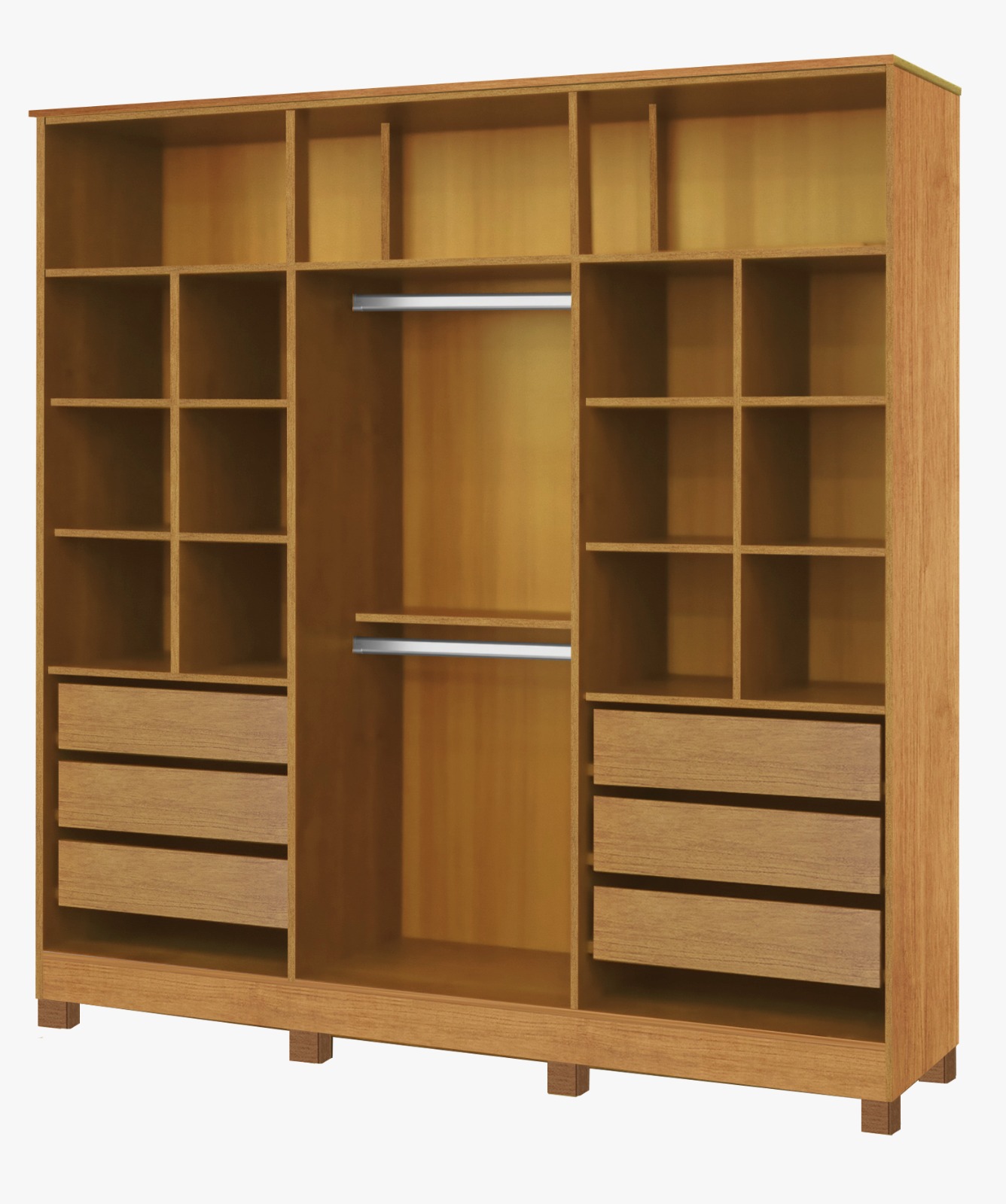 Amplo espaço interno: divisão casal com nichos bem distribuídos e 06 prateleiras funcionais, ideais para roupas, calçados e acessórios.