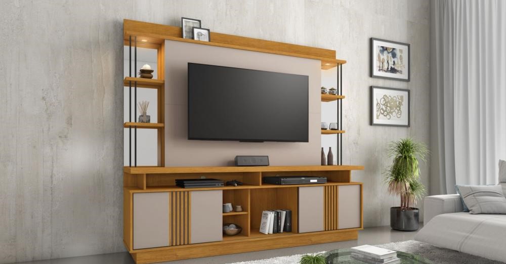 Possui portas de correr com detalhe ripado, luminárias em LED, espelhos decorativos e tubos metálicos, opcionais ideais para deixar sua sala de estar ainda mais bela e aconchegante.